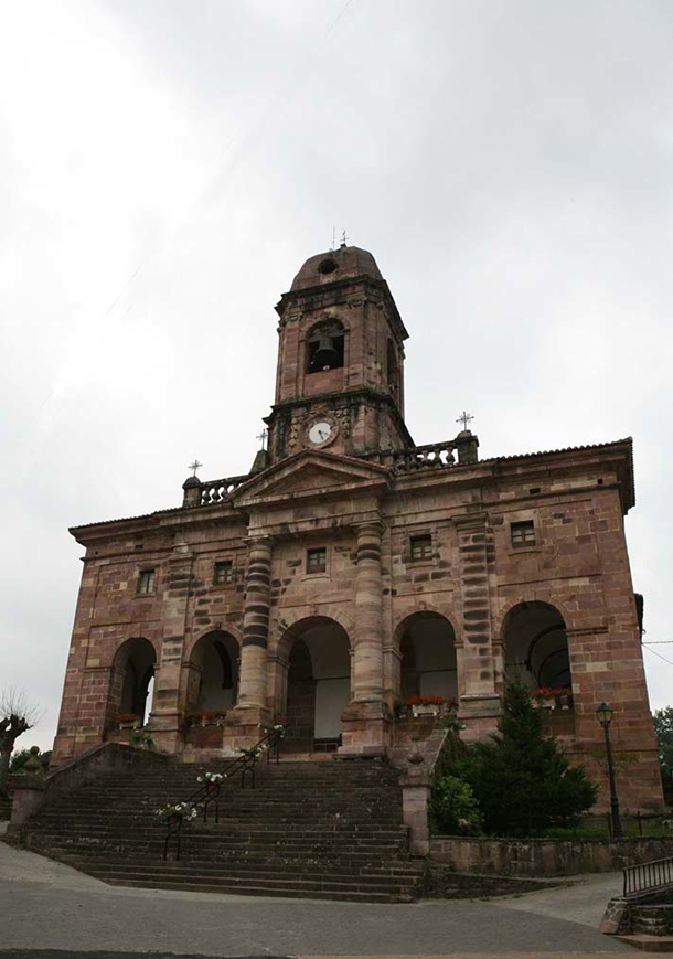 En 1783 la fachada adquirió su aspecto actual mediante la ejecución de la gran escalera de acceso y la adición de los pórticos laterales en simetría con el edificio existente, todo ello de acuerdo con el proyecto del arquitecto Santos Ángel de Ochandátegui, obras que fueron acometidas por el maestro de obras Pedro de Arraurrechea, elevándose el coste a 37.128 reales y 29 maravedíes que envió desde Guatemala Fermín de Ayciñena, natural de la casa Aldecoa en Ziga, como dio a conocer Echeverría Goñi. Atrio porticado que se continúa por los laterales norte y sur con una secuencia de arcos de medio punto sobre pilares pétreos, cubiertos con bóveda de arista al interior de la crujía.