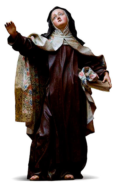 La imagen de Santa Teresa es la de mejor calidad. Presenta a la santa según los modelos popularizados desde el mismo momento de su canonización, en su faceta de escritora inspirada por el Paráclito, dispuesta a escribir y vestida con el hábito y manto carmelitanos. Es en este último donde se desarrollan unas labores polícromas a base de rameados de flores muy colorísticas y típicas de la escuela napolitana. En el rostro de la santa el escultor apuró de manera muy especial las gubias.