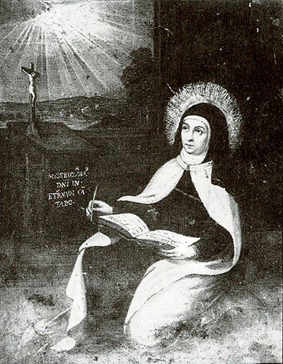 Otra pintura, en este caso sobre cobre, está realizada con técnica minuciosa, es de pequeño tamaño (31 x 25 cm.) y se ha de datar en la primera mitad del siglo XVII. Representa a la santa disponiéndose a escribir con el huso de hilar a sus pies, en una concesión de la composición a favor de un pasaje de la vida cotidiana, ajeno a sus éxtasis, arrobamientos e idealizaciones tan abundantes en su iconografía. Se trata de una versión harto divulgada de lo que el Padre Jean de la Croix denomina como “la pintura de Ana de San Bartolomé y sus derivados”, cuyo original se encuentra en las Carmelitas de Beaune (Francia) y según la inscripción que tiene, era una pieza de la que no se separaba la Madre Ana de San Bartolomé. Copias de la pintura se encuentran en las Carmelitas de Amberes, donde falleció la citada religiosa, en Kain (Bélgica), Sens (Francia), la Encarnación de Ávila, Guadalajara y los conventos de Descalzas de Roma. A su difusión cooperó el hecho de que se grabase en lo fundamental de su composición para el frontispicio del Ceremonial de la Orden en 1616.