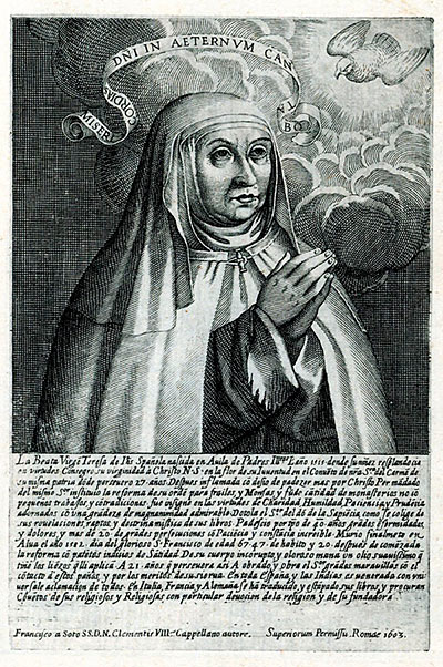 Particular interés posee para el Carmelo pamplonés y la ciudad el grabado que representa a la Madre Teresa de Jesús, según los modelos popularizados en sus primeras estampas, que siguen muy de cerca el retrato que fray Juan de la Miseria le hiciera en 1576. Se repite el modelo orante con las manos juntas, contemplando al Paráclito, acompañada de una filacteria en donde leemos la consabida frase: MISERICORDIAS DOMINI IN AETERNUM CANTABO. Conocemos al generoso mecenas del grabado, que no es otro que el que también hizo abrir la lámina de Catalina de Cristo en 1603 en Roma. Se trata de don Francisco de Soto, sacerdote soriano, primer soprano y decano, por muchos años, de la Capilla Sixtina, capellán de Clemente VIII, que en 1597 fundó en la Ciudad Eterna el primer convento de Carmelitas Descalzas. Una desmedida inscripción nos da cuenta de los principales hechos de su vida. La finalidad de la estampa era, sin dudarlo, postulatoria, en unos momentos en que los procesos de beatificación estaban en plena realización, desde que se abriesen en Salamanca en 1591.