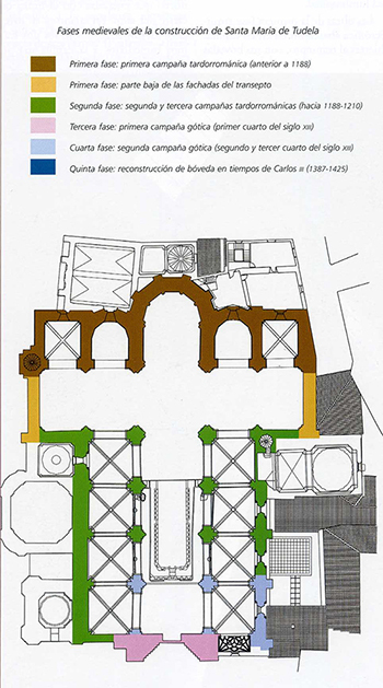 El nuevo edificio tardorrománico, erigido en la segunda mitad del siglo XII, adoptó una fórmula habitual entre las grandes iglesias cristianas: la planta en forma de cruz. Fue iniciado por el exterior de la mezquita, en su parte oriental. El proyecto manifiesta una evidente familiaridad con las iglesias más avanzadas de su época en el Valle del Ebro. Verdaderamente monumental, se planificó con tres naves y una amplia cabecera de cinco capillas paralelas abiertas al transepto. La capilla central y las intermedias se diseñaron con muro de remate curvo, mientras las de los extremos se dispusieron con testero recto. Basta comparar la amplitud y altura del templo con las de otras parroquias urbanas navarras de localidades prósperas de la época, como Santa María de Sangüesa o San Pedro de la Rúa de Estella, para advertir que la ambición arquitectónica y la disponibilidad de medios económicos fueron desde el comienzo señas de identidad de la empresa tudelana.