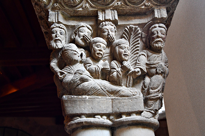 Las representaciones de la vida pública de Jesucristo no se prodigan. Reconocemos las Bodas de Caná en un capitel sobre dos fustes. El Bautismo de Cristo y la predicación de san Juan Bautista se reparten el pilar central (en una cesta muy restaurada; concretamente, el personaje de Jesús, una masa en la que se esbozan los rasgos básicos del protagonista, responde a una intervención del siglo XX). El capitel triple que sigue quizá acogió las tentaciones de Cristo, pero tampoco ha llegado a nuestros días. El situado a continuación ha sido alabado tradicionalmente como una de las piezas más señaladas del claustro, debido a la naturalidad con que el artista tradujo en piedra los detalles de la resurrección de Lázaro. Concretamente, se ha llamado la atención sobre el gesto de varios asistentes de llevarse la mano a la nariz, con lo que dan forma visual a la frase “Señor, ya huele; es el cuarto día” con la que Marta se dirigió a Jesús, frase que servía para disipar dudas acerca de si realmente Lázaro había fallecido. Otras disposiciones de los participantes son igualmente significativas: las hermanas del difunto arrodilladas ante el Señor, el gesto con el índice por parte de Jesucristo, la incorporación del cadáver envuelto en las sábanas mortuorias, etc. Este cúmulo de detalles revela el conocimiento por parte del maestro de figuraciones del milagro arraigadas en la tradición bizantina.