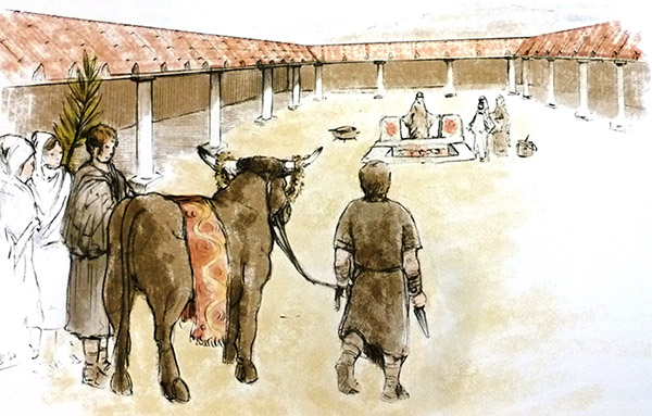 A este sacrificio le precedía una procesión con música, seguida de los adoradores de la diosa Cibeles, figurando en primer lugar los destinados a participar en el taurobolio. Estas curiosas prácticas debieron de pervivir en la villa de Arellano hasta el siglo V, pues la aristocracia que moraba en ella fue la conservadora de los valores religiosos tradicionales quizá como reacción a la política de los emperadores cristianos. La presencia en Arellano, al margen de los mosaicos, de un edificio de carácter religioso, con dos aras con grabados de cabezas de toros, refuerza la teoría de que nos encontramos ante un lugar de culto a Cibeles. La ceremonia sagrada del taurobolio, sacrificio ritual de un toro, está íntimamente asociada a esa diosa.