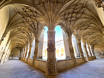 El claustro de planta rectangular articula sus alzados mediante una sucesión de arcos apuntados, sobre pilares octogonales con contrafuertes prismáticos, de frentes y pedestales cajeados, que montan sobre pódium corrido. Los pilares se articulan por pilastras que encuadran en sus frentes hornacinas, de elaborada repisa y doseles avenerados con gallones, casetones y motivos geométricos, rematados por capiteles corridos con grutescos. Los muros perimetrales también quedan recorridos por pilastras cajeadas y hornacinas, delimitando los tramos de las pandas, sobre los que se dispone una ménsula que recibe el enjarje de los nervios mixtilíneos de las elaboradas bóvedas de diverso diseño que cubren todo el claustro.