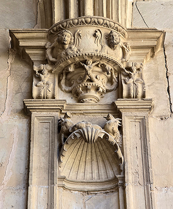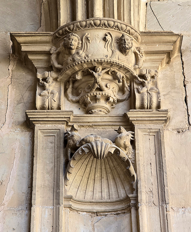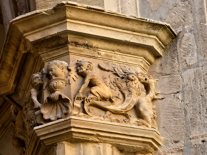El principal interés radica en la decoración escultórica contenida en los capiteles de los pilares, ménsulas y claves de las bóvedas, advirtiéndose en las diferentes pandas una evolución estilística, desde la fase más ornamental del primer renacimiento, hasta las formas más clasicistas. Un programa iconográfico de gran interés, por la calidad de la talla y profusión, donde se representan escenas mitológicas y religiosas mezcladas con grutescos.