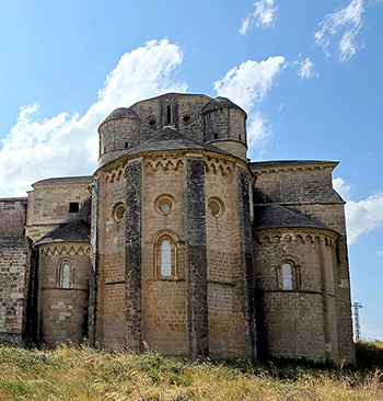 En la cabecera destaca el ábside central poligonal y de mayor tamaño, reforzado por cuatro estribos prismáticos rectos. Los tres ábsides comparten una imposta inferior lisa, la articulación de los vanos y una arquería de trilóbulos ciegos sobre la que monta el tejaroz. En la segunda fase constructiva del templo, acometida a partir del último tercio del siglo XII, se realizaron los canecillos del exterior del ábside central, destacables desde el punto de vista artístico, por su gran calidad y belleza. En ellos se esculpieron figuras humanas, animales reales y fantásticos, además de cabezas o torsos humanos portando útiles de cantero, lo que ha llevado a realizar especulaciones acerca de si se autorretrataron los propios artistas.