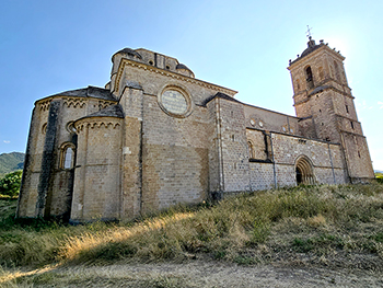 El exterior de la iglesia constituye un juego de volúmenes armónico, con el tripe ábside, los brazos del crucero y el cimborrio románico de planta octogonal con cuatro cuerpos cilíndricos dispuestos en las equinas, rematados por una cubierta cónica pétrea, a lo que suceden las tres naves del templo, de mayor altura la central, y la torre campanario dispuesta a los pies en el flanco noroccidental.