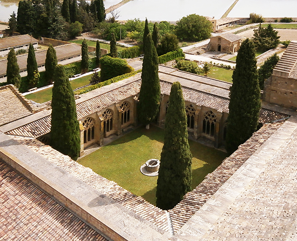 Las dependencias monásticas se organizan en torno a un amplio espacio abierto que, además de comunicar unas con otras, sirve como lugar de meditación y espacio procesional. Siguiendo la obra del crucero, ya en las primeras fases constructivas se iniciaba el ala del capítulo. Perpendicular a ella, y en paralelo al eje de la iglesia, se erigía después el ala del refectorio. El cuadro se cerraba con el ala de la cilla y los legos, la última en construirse. Al claustro sólo podían acceder los monjes, nunca los legos o conversos que vivían en la parte occidental del claustro. Desde su refectorio-dormitorio, un pasillo les llevaba a la iglesia, en la que se les reservaban los tramos más occidentales.