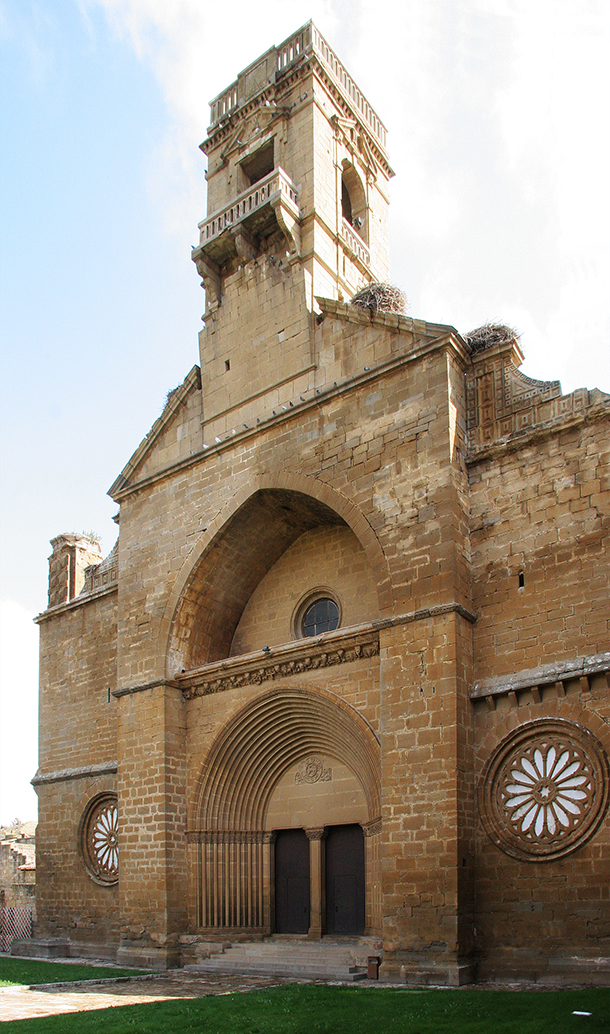 El diseño de la fachada medieval tuvo mucho recorrido en la Navarra del siglo XIII. Se organiza mediante un gran arco de descarga que refleja al exterior el perfil de la nave central. Apea sobre dos imponentes contrafuertes, a cuyos lados quedan las naves laterales, iluminada por dos fantásticos rosetones. Son los más antiguos del gótico navarro. Su tracería se organiza a partir de una flor central de seis pétalos. De ella parten 16 columnillas, asociadas a otros 16 arcos de medio punto entrelazados. Podemos situar su cronología en torno a los últimos años del primer tercio del siglo XIII. En lo sustancial, este diseño de fachada se va a repetir también en Santa María de Tudela y en San Nicolás de Pamplona.