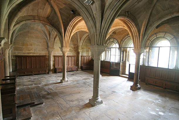Si de la iglesia pasamos al claustro, merece la pena comenzar la visita de las dependencias monásticas por la Sala Capitular. La encontramos tras el tramo de la antigua sacristía y el armarium. Tras la iglesia, esta es la estancia más importante de las dependencias de un monasterio del Císter. Allí se reunían diariamente los monjes en comunidad.