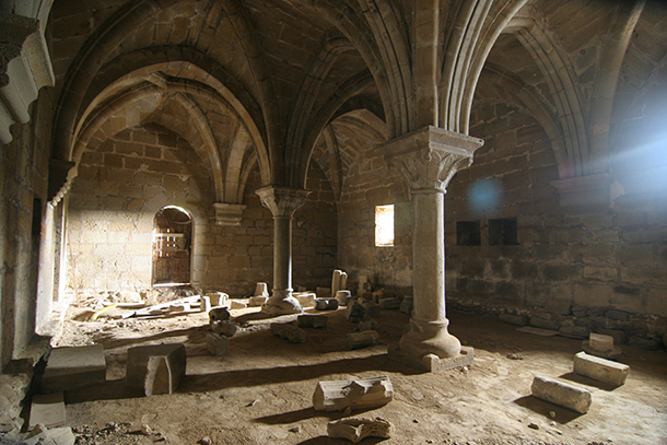 Seguimos avanzando por el ala capitular hacia el norte. Tras los tramos y puertas correspondientes a la escalera del dormitorio, al calabozo y al locutorio, se llega al pasaje que comunica el claustro con el scriptorium o sala de monjes. Esta estupenda sala tiene planta rectangular, con dos columnas exentas en el centro que soportan los seis tramos cuadrados de la bóveda. Aunque recuerda a la sala capitular, el enjarje de soportes, arcos y bóvedas es más regular y avanzada. Se incorporan ya los arcos apuntados en fajones y formeros, las bóvedas parecen más equilibradas y esbeltas, y los capiteles de las columnas amplían notablemente la superficie de sus cimacios. Aunque básicamente también la composición geométrica de cimacios y basas coincide con sus correspondientes en la sala capitular, la decoración de los capiteles es mucho más variada y detallada. Muestran piñas angulares, palmetas centrales y hojas de los vértices. Las características estructurales de esta dependencia recuerdan ya a ejemplos del primer gótico septentrional (Saint Denis, París). Desde el punto de vista cronológico, debemos estar en torno a 1200.