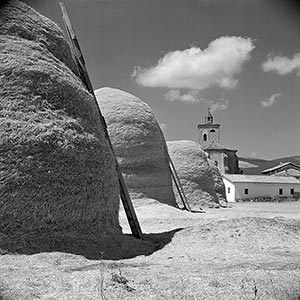 Las fotografías de paisaje, con cielos muy luminosos y perspectivas profundas, nos muestran algunos panoramas desaparecidos, como el río desde los confines de Arazuri, sin la mole de la fábrica de Unión Carbide. También dirigió su mirada a las pajeras, esos montones de paja de forma tronco-piramidal elevados en las eras en el tiempo de la trilla, que le permiten establecer sugestivos juegos de volúmenes entre luces y sombras. Logra un bello efecto en la imagen elegida como ilustración, en la que la sucesión de pajeras crea una perspectiva hacia la torre de la iglesia. Entre los paisajes urbanos, destaca su visión de la calle del Ángulo, con las viejas casas de adobe a la sombra del imponente ayuntamiento. Otro tema habitual fue el paisaje nevado, con perspectivas de gran carga nostálgica.
