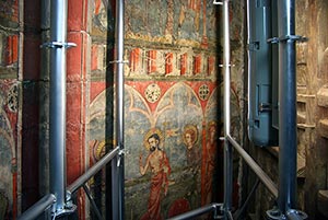Las pinturas murales que decoran la cabecera fueron descubiertas en 2007, después de siglos ocultas y preservadas por el retablo mayor. Se trata de un total de dieciséis escenas organizadas en tres registros que narran la pasión, muerte y resurrección de Cristo (inferior), su nacimiento e infancia (intermedio) y parece que el juicio final (superior). Las mejor conservadas representan el santo entierro, la resurrección y las tres Marías ante el sepulcro. Entre las conservadas parcialmente o en mal estado, destaca el milagro apócrifo del rayo de sol, una iconografía poco frecuente, con Jesús niño cabalgando encima de un rayo de sol mientras sus amigos caen estrepitosamente al suelo al intentar imitarlo.