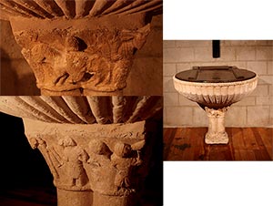 Bajo la torre románica está dispuesta la capilla bautismal, presidida por un crucificado renacentista. La pila bautismal, recién restaurada, presenta un capitel gótico inédito de variada iconografía, en el que pueden distinguirse la lucha de dos guerreros portando escudos, uno a pie y otro a caballo, la figura de un obispo con su báculo y una escena festiva protagonizada por tres personajes. Esta decoración debe de ser coetánea a la arquitectura del templo, cuando se ejecutaría una pila de estilo gótico que, por el motivo que fuese, se renovó en el siglo XVI con la incorporación de una taza gallonada.