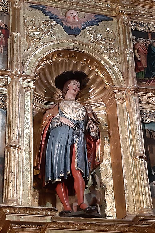 La obra maestra del retablo es la talla de san Julián, una figura de porte muy elegante que parece inspirada en las representaciones del emperador Carlos V. Son similares la vestimenta y el tocado con sombrero plano, la melena corta e incluso la cadena del Toisón de oro, que en Ororbia ha sido sustituida por una cruz. Acompañan al santo un perro y un halcón, referencia a su afición por la caza. Esta imagen tampoco conserva la policromía original. Las esculturas del banco son de una calidad discreta, con excepción de la Virgen con el Niño y San Juanito o Virgen del Rosario, procedente de un retablo colateral romanista desaparecido, cuyo rostro es de gran belleza y se cubre por un velo plegado sobre sí mismo, siguiendo modelos clásicos. Por su parte, la imagen de san Cristóbal, colocada sobre unas andas para procesionar, hay que ponerla en relación con una antigua cofradía que residía en una ermita situada al sur de la población.