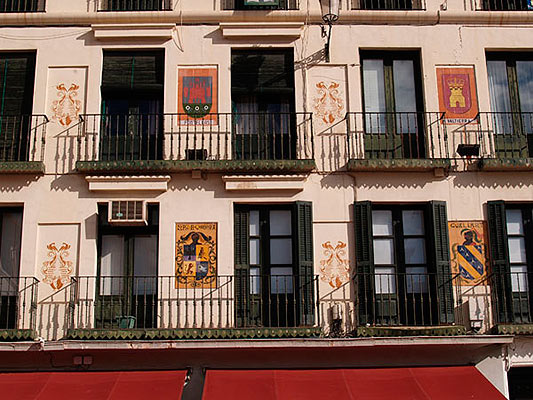 Entre 1966 y 1971 se agregaron a los pisos segundo y tercero los emblemas heráldicos en piedra y cerámica de apellidos ilustres tudelanos y de los pueblos de la merindad, así como nueve cuadros cerámicos de temas taurinos basados en la “Tauromaquia de Goya” instalados en la fachada del santo Hospital. Tres de los emblemas heráldicos adosados a la Casa del Reloj pertenecen al siglo XVIII. El primero es barroco y presenta interior partido con águila sobre corazón con siete rodelas y árbol arrancado con jabalí. El segundo, rococó de la segunda mitad del XVIII, muestra las armas de los Marín. De la misma época es el tercero que expone las armas de Petriz de Cruzat Sarasa. Todos ellos fueron obra del artista local Anselmo Jiménez Blanco.