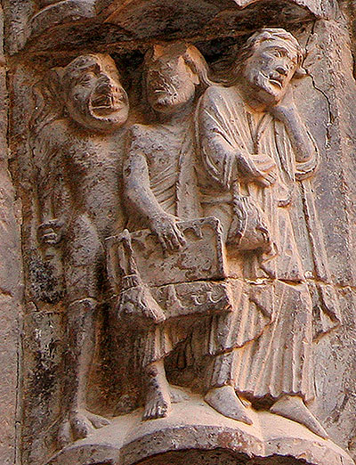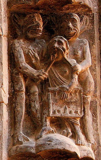 Dentro del pecado de la avaricia, podemos destacar los castigos de los cambistas o prestamistas. Tres veces aparecen representados estos personajes en Tudela. En una dovela, aparecen marchando hacia el infierno, uno con una bolsa de monedas en la mano y otro portando la tabla de cambios. En otra, un banquero sentado ante la mensa nummularia que usaban para el oficio es castigado por dos demonios que le abren la boca con tenazas, ya sea para hacerle tragar sus riquezas, ya para cortarle la lengua, castigo que sufre también otro personaje en otra dovela. Efectivamente, se consideraba que el pecado del usurero, además del fraude, era el engaño y la mentira, y una idea extendida en la Edad Media era que el órgano pecador (en este caso, la lengua) era el órgano castigado. En cuanto al castigo de hacer tragar las riquezas, decía Gonzalo de Berceo sobre los usureros: "Mentranlis por las bocas el oro regalado: diran que non oviesen el tal aver ganado". También en una leyenda recogida por Jacques de Vitry se cuenta que un avaro pidió ser enterrado con una bolsa de sus riquezas al cuello, y cuando sus familiares abrieron su tumba descubrieron horrorizados unos diablillos que le hacían tragar monedas incandescentes.