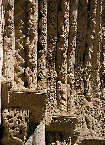 Sin embargo, la mayoría hace referencia a los duales y opuestos resultados del Juicio. Por un lado tendríamos a los salvados, entre los que pueden distinguirse santos en actitud orante, profetas llevando una filacteria o un libro o señalando al Cristo del tímpano, y ancianos del Apocalipsis mostrando redomas. Por otro lado estarían los pecadores y condenados, representados por los pecados más frecuentemente plasmados en el arte románico: la avaricia y la lujuria. La avaricia aparece una sola vez, figurada por un personaje que lleva una bolsa de monedas colgada del cuello, atributo típico de este pecado. De la lujuria en cambio encontramos varios ejemplos que en ocasiones muestran la iconografía característica de este vicio –una mujer desnuda mordida por serpientes o sapos en puntos muy significativos de su anatomía–, pero en otras siguen fórmulas más insólitas y por ello más interesantes –un masturbador y un exhibicionista–. Con ellos habría que conectar otro grupo de esculturas, integrado por músicos, bailarinas y acróbatas, habida cuenta del negativo concepto que la Iglesia tenía de sus actividades.
