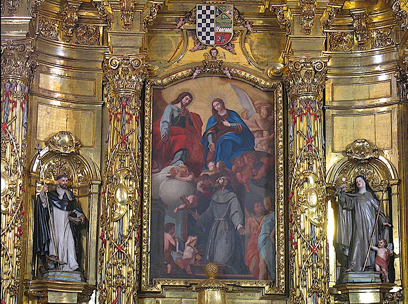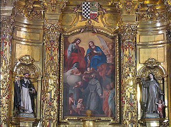 La iconografía del conjunto presenta en el cuerpo principal un lienzo con el tema de la Glorificación de san Francisco, y a sus lados sendas tallas de santo Domingo de Guzmán y santa Clara, de filiación madrileña; en el ático encontramos el lienzo de la titular del convento Nuestra Señora de los Ángeles, con el tema de la Coronación de la Virgen entre ángeles músicos y cuatro esculturas de alegorías de virtudes sobre los entablamentos.
