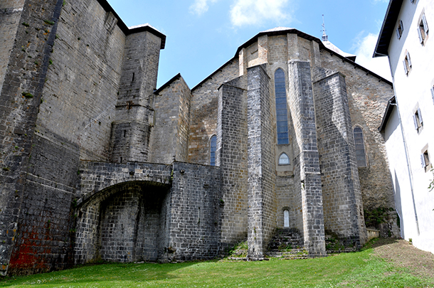 Ya en la segunda mitad del siglo XII consta la existencia de un gran edificio hospitalario, del que apenas conservamos a la vista un largo muro tardorrománico. Se edificó a continuación la capilla del Espíritu Santo, singular carnario o sepultura comunitaria que facilitó el enterramiento de los peregrinos desde el entorno de 1200. A principios del siglo XIII Sancho VII el Fuerte impulsó la construcción de la iglesia, escogida por dicho monarca como lugar de enterramiento. Poco a poco nuevas fábricas fueron completando un conjunto excepcional: la capilla de Santiago del siglo XIII, un hermoso claustro en el siglo XIV (hundido por el peso la nieve hacia 1600), la capilla aneja de San Agustín, de la misma centuria, y otras dependencias canonicales. La rudeza del clima y el devenir de la historia determinaron la sustitución de cierto número de edificios: el gran hospital fue reedificado una y otra vez, circunstancia que igualmente afectó a las casas de las dignidades eclesiales (prior, canónigos y beneficiados) y otros habitantes del lugar. La hermosa iglesia gótica también sufrió drásticas modificaciones en época moderna, hasta perder su carácter medieval. Una restauración bienintencionada pero excesiva de la primera mitad del siglo XX fue seguida décadas después por actuaciones más respetuosas que le han conferido el carácter que hoy presenta.