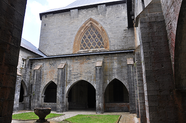 Al sur de la iglesia hubo un claustro gótico inspirado en el de la catedral de Pamplona, que se hundió bajo el peso de la nieve en 1600. Las trazas del nuevo se encargaron en 1605 a Juan de Aranegui y Oyarzun. La construcción fue iniciada en 1615. El recurso a arcos apuntados y la sensación de pesadez arcaizante puede explicarse por la reutilización parcial de elementos antiguos y por la necesidad de resistir frecuentes e intensas nevadas. Conecta con el estilo herreriano en detalles como los capiteles reducidos a simples molduras y el desarrollo de sobrios contrafuertes rectangulares. En 1930, a consecuencia de una intervención en el zócalo, aparecieron nichos medievales que fueron puestos al descubierto. Junto a la puerta de acceso a la escalera de la sobrebóveda de San Agustín se localiza la lápida sepulcral del caballero Fernando de Ayanz (†1393).