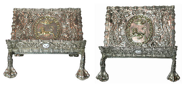 Pareja de atriles de plata en su color y dorada, que se asientan sobre cuatro potentes patas de garra con bola. Se componen de un espaldar recto con perfil recorrido por una moldura de elementos geométricos, óvalos y rectángulos alternos, de gran rigidez que inscriben decoración de hojas y ces vegetales. En el centro se enmarca una cartela oval sustentada por dos angelotes, que inscribe las armas de Pamplona, el león pasante timbrado por corona real y orlado de cadenas. Presenta faldón mixtilíneo con decoración de roleos vegetales que se disponen enmarcando el emblema del regimiento pamplonés, las cinco llagas, realizadas en esmalte a la porcelana.