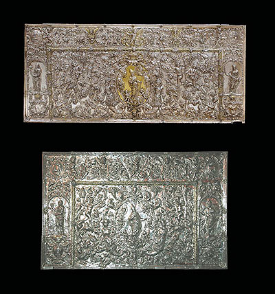 Sin embargo, debido a los avatares del tiempo de las cuatro obras encargadas por el Ayuntamiento para la capilla del Santo, sólo han llegado hasta nuestros días dos de ellas, un frontal y la credencia. Probablemente, como indica la Dra. Orbe Sivatte, la remodelación de la capilla de San Fermín a principios del siglo XIX, que supuso la supresión de los retablos laterales, hizo que los dos frontales que en ellos se colocaban cayesen en desuso y fueran desechados por la obrería dela capilla. En el caso del frontal, el hecho de que todos obedeciesen al diseño realizado por Hernando de Yabar, y a que cronológicamente son muy cercanos en el tiempo, impide atribuir el mismo a uno de los dos plateros que los habían realizado, siendo posible pensar que la pieza conservada es la primera que se realizó, obra de Hernando Yabar, que sirvió de modelo a las otras dos. Mientras que conocemos la autoría de la credencia gracias a las marcas que presenta estampadas en sus superficie, la de localidad, la doble PP coronada correspondiente a Pamplona, y la de autor, una venera, punzón del platero Juan Antonio Hernández, autoría refrendada por la documentación.