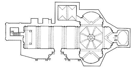Edificio construido en piedra de sillería con planta de cruz latina con nave de cuatro tramos y crucero trebolado, con brazos y ábside semicirculares al interior y poligonales al exterior. En la nave, con coro alto a los pies, se disponen pilastras de orden compuesto y cubierta de bóveda de medio cañón. Mientras que el crucero se articula por medio de tres exedras cubiertas por cúpulas de cuarto de esfera que dan paso a una cúpula sobre pechinas y tambor octogonal, que al exterior se traduce en un cuerpo de ladrillo. El tambor presenta grandes ventanales que permiten la entrada de luz en contraste con la mayor penumbra de la nave de la iglesia. Esta concepción espacial se constituye como uno de los ejemplos más escenográficos y teatrales de todo el barroco navarro, centrando el protagonismo del templo. La teatralidad de este espacio viene remarcado por la plasticidad arquitectónica y decorativa de los muros. Desde el ábside, y a través de dos puertas situadas en los laterales del retablo mayor, se pasa al camarín, de planta rectangular con cúpula elíptica sobre pechinas y muros articulados mediante pilastras de orden compuesto. La sacristía, situada en el ángulo formado por el brazo norte de la nave y el crucero, es un espacio rectangular de gran sencillez cubierto por bóveda de medio cañón con lunetos.