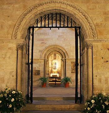 A cada nave se abre una puerta también de perfil semicircular; en la imagen vemos la central, de mayor tamaño y desarrollo decorativo. Se organiza con una chambrana taqueada, arco baquetonado y sendas columnillas con capiteles de entrelazos y mascarón con tallos que nacen de su boca. Luego veremos un detalle de un capitel parecido.