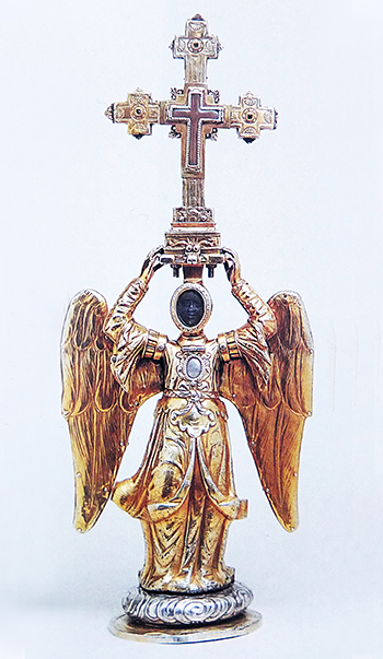 Era necesario llegar a San Miguel, protagonista esencial del conjunto de fe, tradiciones y leyendas que lo bordan a la ladera de la montaña. Y ese San Miguel mítico, litúrgico y espiritual se concreta en una imagen de plata con alma de madera, que ha sido desde la Edad Media un objeto tan adorado como preciado. Tal y como lo vemos hoy, aparece ya representado, por ejemplo, en un capitel del siglo XIII de la portada de la parroquia de Berrioplano, demostrando ya entonces su disposición viajera.