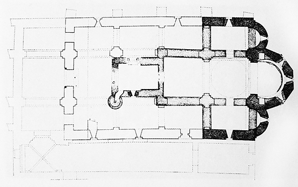 La presencia del atrio y su extensión al nártex de los pies es perfectamente visible en esta planta del edificio. Fue publicada por Íñiguez en el primer volumen del Arte Medieval Navarro (p. 79) y da cuenta, además de la estructura general del santuario, de los resultados de las excavaciones realizadas durante su restauración. De menor a mayor intensidad de línea, diferenciamos atrio y nártex, las tres naves del templo, y la hipótesis de su configuración primitiva en su mitad oriental. Curiosamente, esta composición más antigua concuerda con los hallazgos realizados recientemente en la ermita de San Esteban de Larunbe.