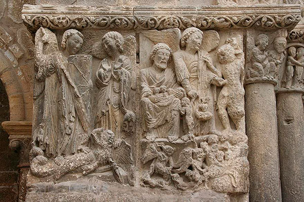 El segundo relieve representa el peso de las almas, imagen a menudo empleada en época románica para aludir al juicio individual post mortem. El arcángel san Miguel sujeta con su mano izquierda la balanza, bastante deteriorada. Con la derecha guía a una figurita desnuda, el alma de un bienaventurado, hacia el personaje sedente que se encuentra a su lado, Abraham, reconocible por acoger en su seno cabecitas que corresponden a otras tantas almas de bienaventurados. Esta era la morada de los justos después de la muerte anunciada en la parábola evangélica del rico Epulón y el pobre Lázaro. Al otro lado del arcángel se encuentra la deforme presencia del demonio. En un registro inferior, bajo los pies de estos tres personajes, se ve una cabeza monstruosa entre cuyas mandíbulas asoman cabecitas, mientras dos seres deformes alados se dirigen hacia ella, uno avivando con un fuelle el fuego eterno y otro arrastrando a desventurados hacia su pavoroso destino.