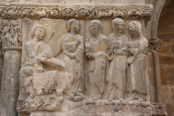 Al otro lado de la puerta están colocadas otras dos lastras que esta vez conforman una única escena: la visita de las tres Marías al sepulcro vacío de Cristo en la mañana de Pascua. En la izquierda aparece el sarcófago en el que está sentado un ángel, con uno de esos cruzamientos de piernas imposibles tan frecuentes en el románico. Levanta la tapa mientras señala hacia la sábana que asoma por el borde. De pie ante del sarcófago se encuentra un segundo ángel, que levanta su mano derecha para evidenciar que habla a las tres mujeres. Lo que les dice está escrito en el sepulcro: SURREXIT NON EST HIC, es decir, “Ha resucitado, no está aquí”, cuatro de las palabras pronunciadas por el ángel según el evangelio de Marcos. Bajo el sarcófago están recostados dos soldados de la guardia, dormidos.