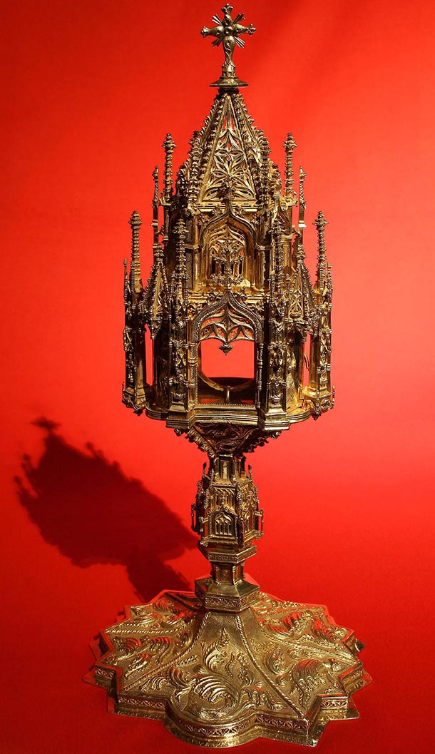 La custodia cuenta una base poligonal mixtilínea en la que se alternan las puntas de estrella y los lóbulos circulares. Al igual que sucede con numerosas piezas de orfebrería gótica, esta custodia hace gala de un señalado carácter arquitectónico. En el astil, de composición compleja, el nudo destaca por medio de un pequeño templete hexagonal con arcos conopiales, contrafuertes y pináculos. La parte superior, destinada a albergar a la Sagrada Forma, se articula en dos cuerpos cubiertos con un chapitel calado. El cuerpo inferior se decora con un arco conopial con balaustres entre hornacinas con chapiteles calados, contrafuertes con pináculos y arbotantes. Este primer cuerpo cobija ángeles con atributos de la Pasión, apóstoles y otros santos. El cuerpo superior se decora con arcos conopiales con tracería.