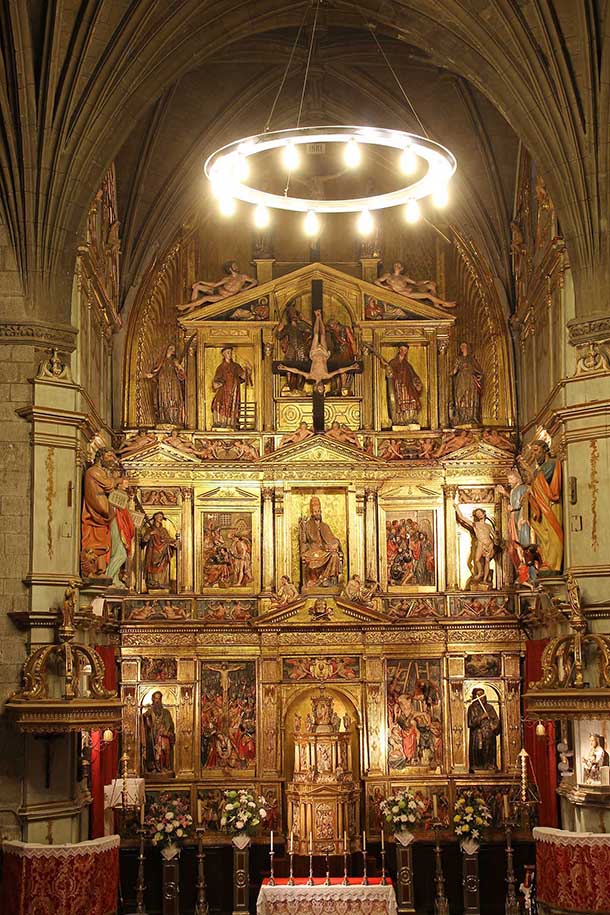 Por una parte, el banco, cercano al altar donde se celebra el sacrificio de la misa, aloja escenas que corresponden en su mayor parte al ciclo de la Pasión: la Cruz a cuestas, la Flagelación, Jesús ante Pilatos, el Prendimiento. En el primer cuerpo se sitúan las imágenes de San Pablo con un relieve de su martirio, la Crucifixión, el Descendimiento y San Francisco de Asís con un relieve de la aparición del ángel al santo. El centro de este cuerpo, como es habitual en este momento, se reserva para la Eucaristía. Bajo un arco de medio punto, como si de un arco de triunfo se tratase, se sitúa un exquisito sagrario expositor de dos pisos rematado por un templete. El tabernáculo se decora con escenas alusivas a la Eucaristía y personajes que prefiguraron de algún modo este Sacramento. El segundo cuerpo del retablo se dedica en su mayor parte al titular. En el centro, San Pedro en la cátedra flanqueado por las escenas de su liberación por un ángel y la concesión del Primado. En el extremo del evangelio, San Esteban protomártir y en el de la Epístola San Sebastián. Finalmente, el ático se completa con las imágenes de San Lorenzo y San Vicente junto con la Crucifixión de San Pedro y en los laterales Santa Catalina y Santa Quiteria. Corona el conjunto un calvario. Junto a estas imágenes se añaden varios relieves y esculturas de virtudes, ángeles pasionarios y otras figuras desnudas, como las de Adán y Eva, cuyo estilo recuerda a los modelos del manierismo miguelangelesco. Figuras desnudas recostadas sobre los frontones que evocan a las que colocó Miguel Ángel en las tumbas de los Médici. En suma, una escultura que, a juicio de García Gainza, es rica y de indudable calidad.