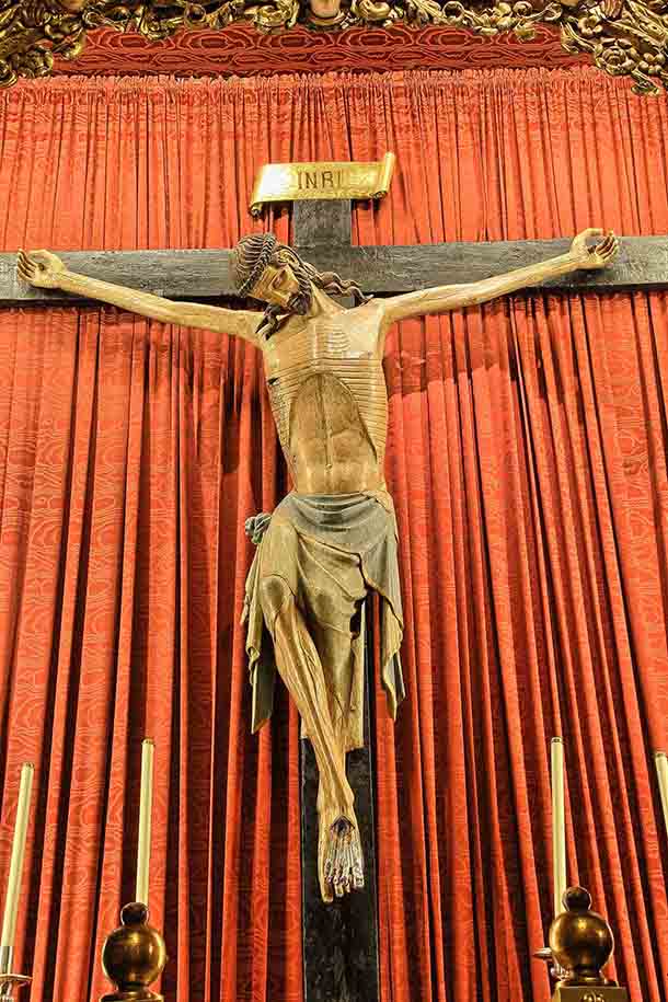 El Santo Cristo del Amparo de Aibar es, tanto por su devoción como por su calidad, un foco de atención y de especial interés en la parroquia de San Pedro. Este crucificado gótico, datado hacia 1350 aproximadamente, es una buena muestra de la imaginería de mediados del siglo XIV. Frente a los crucificados románicos, donde la finalidad más destacada era representar la majestad de Cristo en su trono, aquí se aprecia a un Jesús doloroso y moribundo. En este sentido, la corona de rey, es sustituida por una corona trenzada de tres cabos. Por otro lado, los cuatro clavos románicos se reemplazan por tres clavos, con los pies atravesados por uno solo, característica que permite adscribir la imagen al periodo gótico, estilo al que se atribuye esta innovación. Cristo vertical y de proporciones esbeltas donde las influencias de algunos crucificados franceses e italianos se hacen patentes. Estos rasgos permiten a Fernández-Ladreda vincularlo a los llamados “Crucifijos esbeltos” de la zona navarra-catalano-aragonesa. Se trata, pues, de una imagen de gran calidad frente a otros ejemplos existentes que han sufrido destacadas transformaciones.