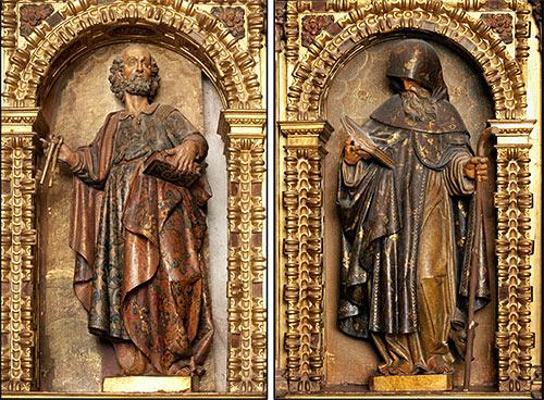 Flanqueando la capilla mayor se sitúan dos retablos gemelos que fueron realizados por Bartolomé Calvo en 1654. Se terminaron de pagar un año más tarde. Están dedicados a san Pedro, en el lado del Evangelio, y a san Antón en el lado de la Epístola. Constan de pedestal, un único cuerpo con caja central flanqueada por columnas pareadas corintias, y un ático de remate coronado por frontón semicircular. Los pinjantes, racimos de frutos, guirnaldas, roleos carnosos, gallones y frontones partidos avolutados nos conducen ya definitivamente al Barroco, aunque todavía de tintes clasicistas. Destaca en ellos la policromía original de su mazonería.