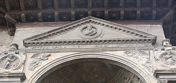 Remata la portada, sobre la exedra, un frontón triangular recto con modillones en la parte inferior de las molduras, y sendos encuadramientos rectos, con decoración de cueros recortados y cintas planas, que enmarcan tondos, sobre las pilastras que rematan las calles laterales. El primero, de gran simplicidad, está centrado por un medallón en el que se sitúa el busto del rey David, mientras que los tondos laterales inscriben en su interior las figuras de San Juan, el del lateral izquierdo, y Zacarías, el del lateral derecho. David se representa de busto, en un marcado altorrelieve, en edad madura y barbado, con el arpa alusiva a su condición de músico del rey Saúl en la mano. San Juan Bautista figura en un paisaje desértico, vestido con la piel de camello y una túnica, con pelo largo y barbado, portando con la mano izquierda la cruz y con la derecha señalando al cordero, símbolo de Cristo, que está recostado sobre el tronco de un árbol y un libro. Mientras que Zacarías está representado como un profeta del Antiguo Testamento, sosteniendo una filacteria en las manos, e inscrito en un paisaje similar al de san Juan.