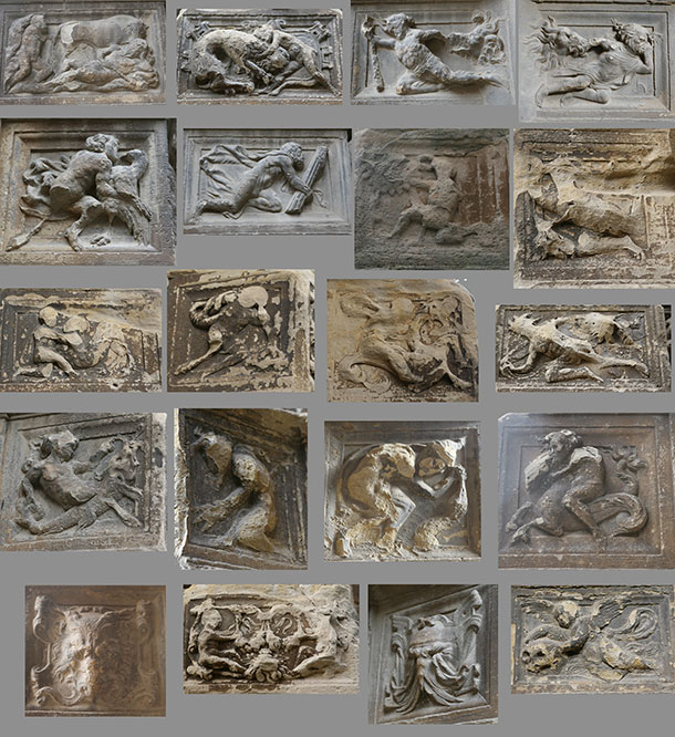 En el basamento de la portada, distribuidos en tableros y netos, se representan 31 relieve historiados con temas relativos a los trabajos de Hércules, que alternan con animales y seres fantásticos y grutescos. Entre los temas relativos a Hércules encontramos alguno de sus trabajos más conocidos, como sus luchas contra el león de Nemea, la hidra de Lerna, el jabalí de Erimanto, las aves del lago Estinfalo o el gigante Gerión, así como otros no integrados en sus trabajos o formando parte secundaria de los mismos, como sus luchas contra el león de Citerón, el gigante Caco o el dios río Aqueloo, además de Hércules como alegoría de la fortaleza. Algunas de estas escenas las podemos poner en relación con su significado simbólico como alegorías de la lucha contra alguno de los pecados más frecuentes, como la soberbia, la lujuria o la avaricia. Esta interpretación de temas clásicos tamizados desde un punto de vista cristiano será una de las constantes del Renacimiento, y la figura de Hércules, el héroe clásico por antonomasia, se reconoce como una prefiguración de Cristo, en su calidad de héroe virtuoso que lucha contra el mal. Por lo que la presencia de estos temas en la portada de la iglesia habría que interpretarla desde una lectura de la victoria de la virtud sobre el vicio, del bien sobre el mal, encarnados por la figura de Cristo, nuevo Hércules, que con su muerte redime al hombre. Y las historias de Hércules se alternan con representaciones de grutescos, ángeles, niños, bucráneos, tarjas, animales y seres fantásticos, etc., entre los que se encuentran temas y monstruos marinos, que durante el siglo XVI tenían una simbología de inmortalidad. Estos temas servirán como ejemplo a los fieles de la actitud a seguir, y por ello se colocan en el basamento de la portada, para que sean fácilmente visibles, ya que simbolizan la esperanza de la vida tras la muerte, encarnada en la creencia en la Redención de los hombres alcanzada gracias a la muerte de Cristo.