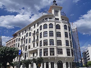 La sociedad de seguros “La Vasco Navarra”, fundada en 1900 en un piso de la calle Mercaderes, conoció dos emplazamientos sucesivos en la plaza del Castillo y en Navas de Tolosa, antes de decidir construir su sede central en el recién estrenado Ensanche pamplonés.