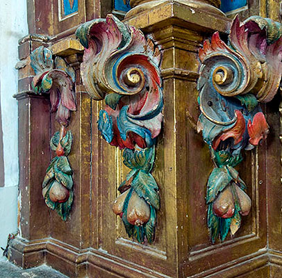 Su dorado y policromía fue obra del aragonés Francisco del Plano en 1684, realizada con delicadeza y pulcritud, según un contrato en el que constaban todo tipo de detalles. El conjunto con distintos tratamientos del oro en sus estofados es de lo mejor que se conserva en Navarra del periodo, lo que se explica, en parte, por la extraordinaria calidad de quien lo llevó a cabo, Francisco del Plano, dorador y gran pintor aragonés del momento que destacó por sus grandes decoraciones barrocas y escenográficas, como el conjunto de retablos del convento de San Francisco de Viana.