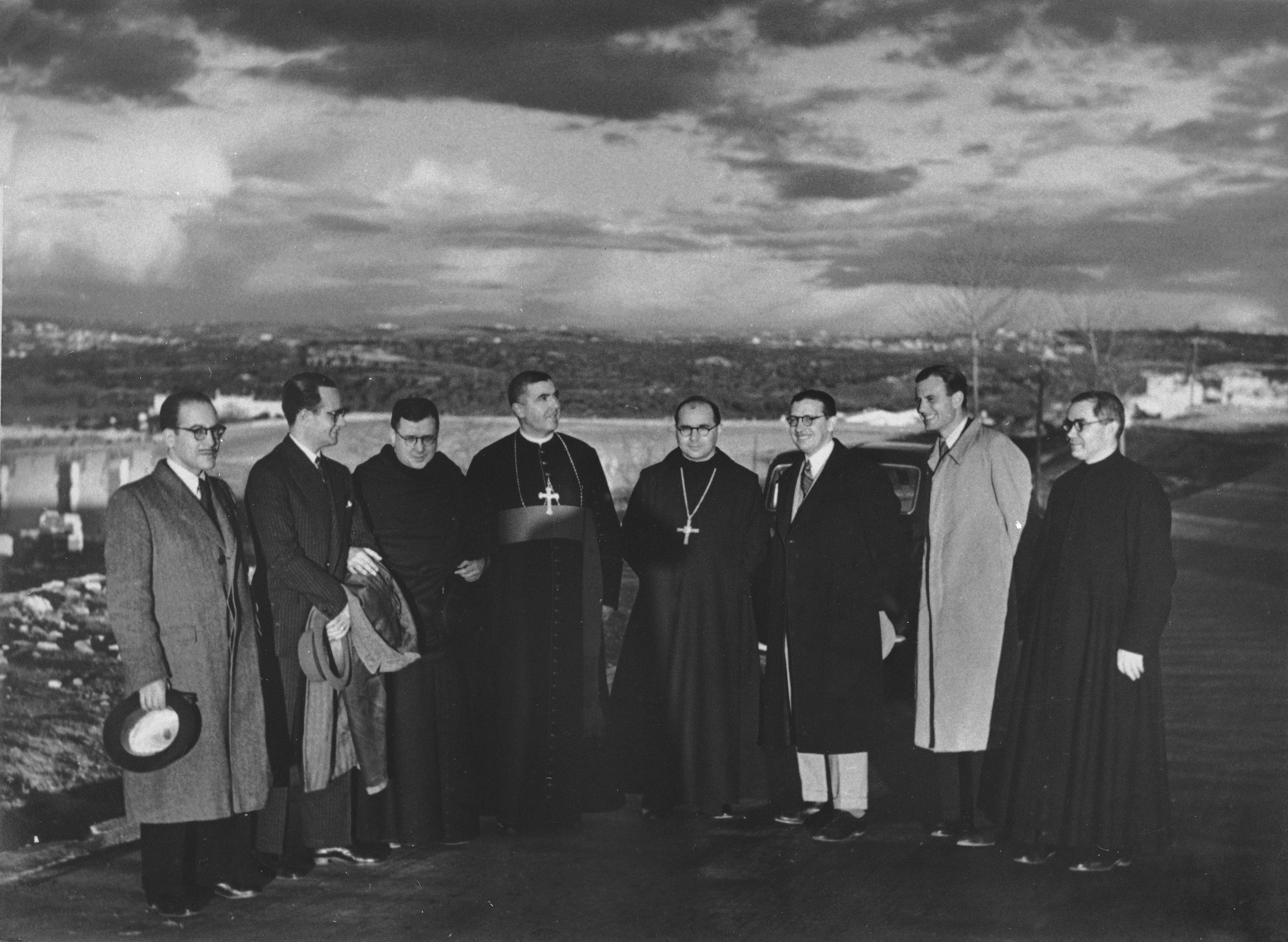 Cuesta de las Perdices, 1944. De izquierda a derecha: Ricardo Fernández Vallespín, José María Hernández Garnica, Josemaría Escrivá, monseñor Javier Lauzurica, abad Aurelio Escarré, Álvaro del Portillo, José Luis Múzquiz.