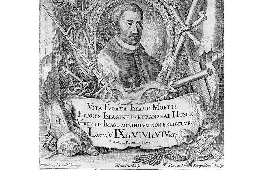FotoCedida/Detalle del grabado de Juan de Palafox, acompañado de elementos de vanitas, por Pedro Villafranca, 1665