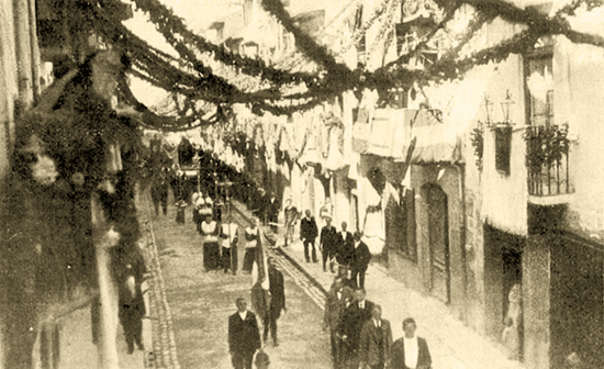 Desfile de la gran procesión por las calles de Sangüesa. Foto de la Crónica del Centenario