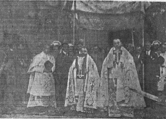Los párrocos de Santa María y Santiago de Sangüesa con la reliquia del santo y el Cristo del cangrejo en el desfile procesional al salir del templo de San Salvador. Foto Uranga, publicada en Diario de Navarra 23 de septiembre de 1922