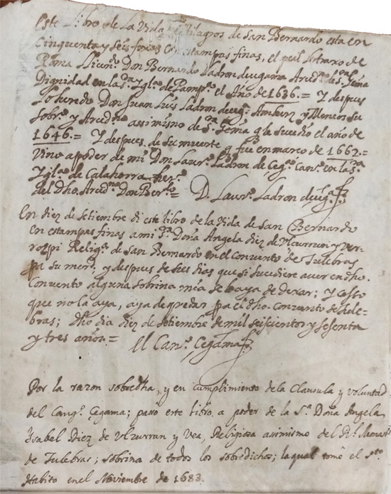 Del ejemplar de Tulebras, conocemos todo lo relativo a su particular historia, gracias a una larga inscripción manuscrita en el reverso de una de sus estampas. Fue adquirido en Roma, en 1633, por el canónigo de la catedral de Pamplona y arcediano de Santa Gema, Bernardo Ladrón de Cegama, advirtiendo que contenía “cinquenta y seis foxas con estampas finas”. A su muerte, pasó a su sobrino Juan Luis Ladrón de Cegama, que ocupó la misma dignidad desde 1646. Al fallecer este último, fue a parar al canónigo calagurritano Laurencio Ladrón de Cegama que lo entregó en 1663 a la monja de Tulebras doña Ángela Díez de Ulzurrun y Berrozpe, “y después de sus días que si sucediere aver en dicho convento alguna sobrina mía se haya de dejar y caso que no la aya, aya de quedar para el dicho convento de Tulebras”. Una anotación posterior de 1683, recoge esta apostilla: “Por la razón sobredicha, y en cumplimiento de la cláusula y voluntad del canónigo Cegama, pasó este libro a poder de la señora doña Ángela Ysabel Díez de Ulzurrun y Vea, religiosa asimismo del Real Monasterio de Tulebras, sobrina de todos los sobredichos, la qual tomó el santo hábito en el noviembre de 1683” y fue abadesa, excepcionalmente, durante cuatro cuadrienios.