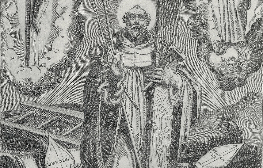 Foto /Detalle del grabado de san Bernardo con las arma Christi, perteneciente a la vida ilustrada editada en Roma en 1587