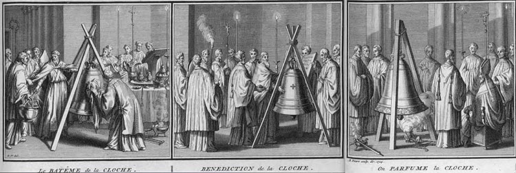 Bendición de la campana, según un grabado de B. Picart en la obra Cérémonies et coutumes religieuses de tous les peuples du monde (1723)