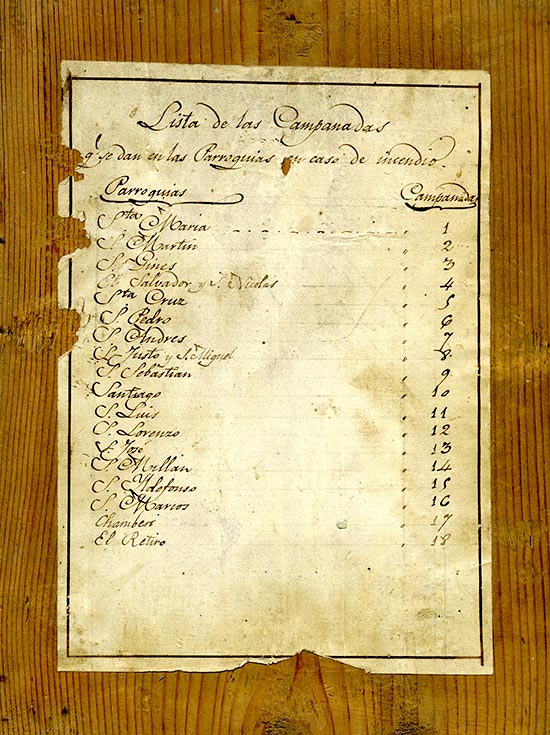 Tablilla con un folio manuscrito, de comienzos del siglo XIX, en el que constan las campanadas se tocaban en caso de incendio en las parroquias de Madrid. Colección Particular