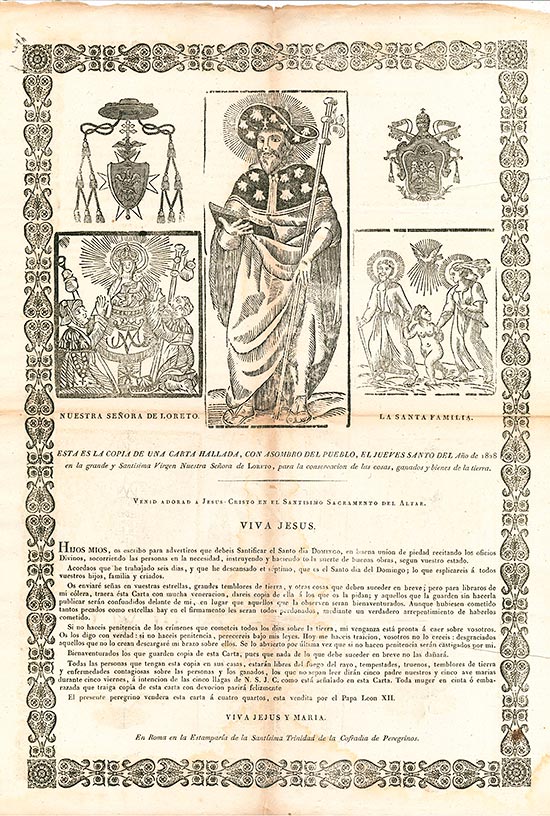 Pasemos a la descripción de la gran hoja impresa. Lleva pie de la supuesta imprenta romana de la “Estampería de la Santísima Trinidad de la Cofradía de los Peregrinos”, con toda probabilidad falsa ya que, como veremos, otros detalles del impreso nos llevan a pensar que se hizo en tierras hispanas. Una orla tipográfica bastante común en gozos del momento encierra unas imágenes en la parte superior y el texto de una oración en la inferior. En el centro encontramos el título, que reza así: “ESTA ES COPIA DE UNA CARTA HALLADA, CON ASOMBRO DEL PUEBLO, EL JUEVES SANTO DEL Año de 1828 / en la grande y Santísima Virgen de Nuestra Señora de LORETO, para la conservación de las cosas, ganados y bienes de la tierra”.